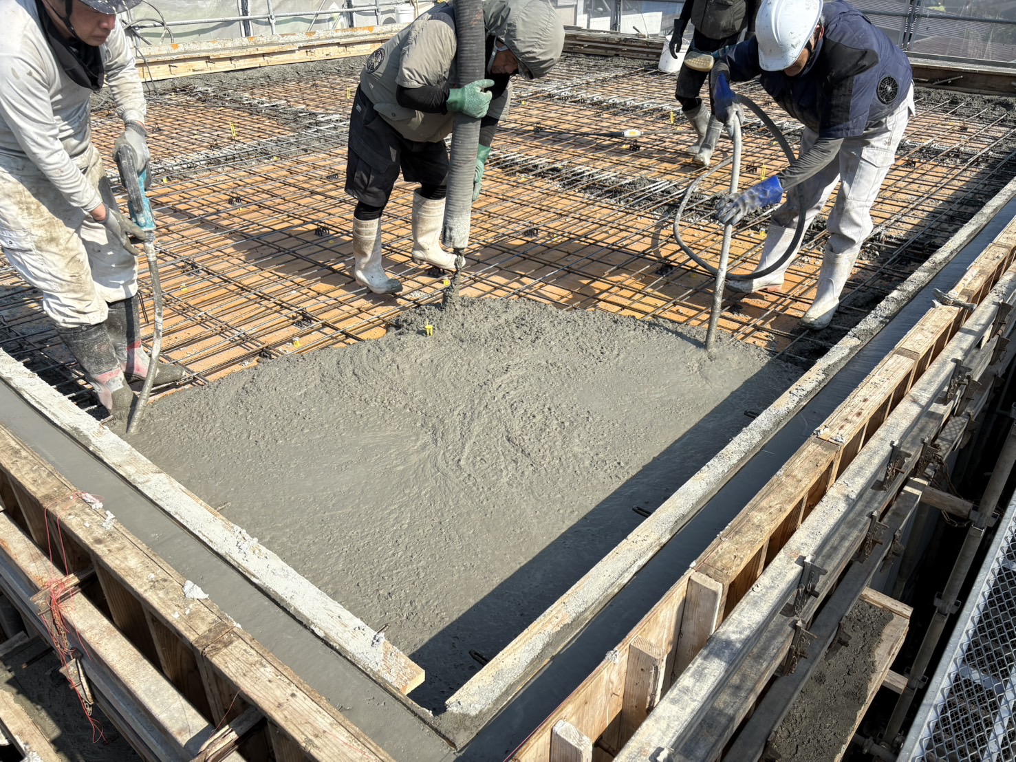 バイブレーターの振動で生コンを締め固めています。簡単そうに見えてとても調整が難しく、かけ過ぎてもかけなさ過ぎてもコンクリートが固まったときに不良がでてくるのでとても重要な作業です。